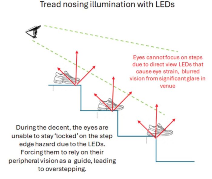 Problems with Traditional LEDs – Direct-view LEDs can overwhelm the eyes, causing momentary ash blindness and loss of step visibility—especially dangerous in dark settings. This effect is even more pronounced for the middle-aged and elderly, who are most at risk for falls.